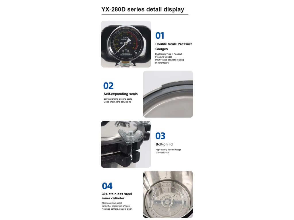 Vysoký výkon a přesnost: topné těleso o výkonu 2000W spolu s automatickým časovačem zajišťují stabilní podmínky, manometr umožňuje v každém okamžiku sledovat aktuální tlak a teplotu uvnitř nádoby.